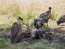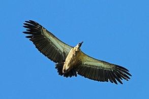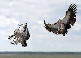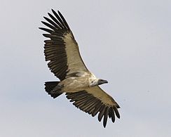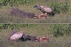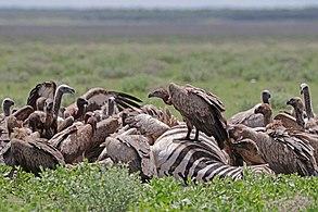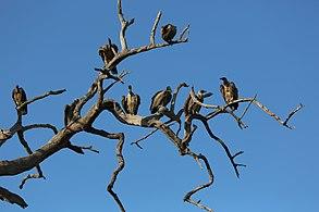 White-backed vultures circle through the sky in search of freshly dead animals, often following other scavenger birds and mammalian carnivores to find it.[15] Once a carcass is found, they will begin wheeling in the sky, signalling their discovery to other vultures. After feeding, white-backed vultures often rest with their wings spread and their backs facing the sun, as they have gorged themselves so much they can no longer fly.[16]
