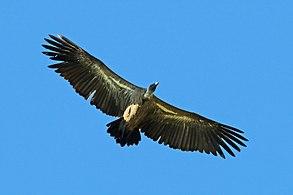 The white-backed vulture is a typical vulture, with only down feathers on the head and neck, very broad wings and short tail feathers. It has a white neck ruff. The adult's whitish back contrasts with the otherwise dark plumage. Juveniles are largely dark. This is a medium-sized vulture; its body mass is 4.2 to 7.2 kilograms (9.3–15.9 lb), it is 78 to 98 cm (31 to 39 in) long and has a 1.96 to 2.25 m (6 to 7 ft) wingspan.[2][3][4]