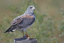Its preferred hunting technique is to hover and observe the surroundings for signs of potential prey, gliding to another place when nothing is found. The diet of the white-tailed hawk varies with its environment. Rabbits make up the majority of the hawk's diet in southern Texas, while lizards of 12 in (30 cm) in length and more are the preferred prey in the Dutch West Indies. Other animals such as cotton rats, snakes, frogs, arthropods (especially grasshoppers, cicadas and beetles), and smallish birds such as passerines or quails are also eaten; it will snatch chickens when no other source of food is available. In the open cerrado of Brazil, mixed-species feeding flocks will react to a white-tailed hawk with almost as much alarm as they do when seeing such dedicated predators of birds as the aplomado falcon.[7] The white-tailed hawk is also known to feed on carrion and to gather with other birds at brushfires to catch small animals fleeing the flames.[8] In the tropics, white-tailed hawks rank amongst the main predators of the small monkeys known as marmosets.[9]