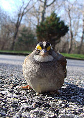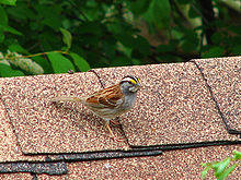 Despite a high level of con-specific rivalry within white-throated sparrows, this species is often dominated by other seed-eating winter residents, even those that are no larger than itself like the song sparrow, and thus may endure high levels of predation while foraging since restricted to sub-optimal sites at times by competition.[12] Not to mention numerous mammalian carnivores, at least ten avian predators often hunt them and they are among the most regular prey species for some smaller raptors, i.e. the sharp-shinned hawk and eastern screech-owl.[13][14]