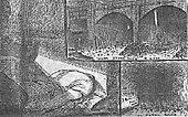 A woman's torso was found at 5:15 a.m. on Tuesday 10 September 1889 under a railway arch in Pinchin Street, Whitechapel.[120] Extensive bruising about the victim's back, hip, and arm indicated that she had been severely beaten shortly before her death, which had occurred approximately one day prior to the discovery of her torso. The victim's abdomen was also extensively mutilated in a manner reminiscent of the Ripper, although her genitals had not been wounded.[121] The dismembered sections of the body are believed to have been transported to the railway arch, hidden under an old chemise.[122] The age of the victim was estimated at 30–40 years.[123] Despite a search of the area, no other sections of her body were ever found, and neither the victim nor the culprit were ever identified.[121]