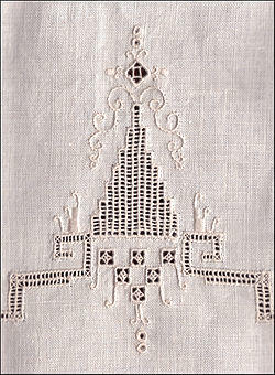 Whitework embroidery refers to any embroidery technique in which the stitching is the same color as the foundation fabric (traditionally white linen). Styles of whitework embroidery include most drawn thread work, broderie anglaise, Hardanger embroidery, Hedebo embroidery, Mountmellick embroidery, reticella and Schwalm. Whitework embroidery is one of the techniques employed in heirloom sewing for blouses, christening gowns, baby bonnets, and other small articles.