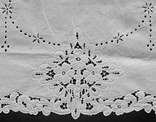 The term whitework encompasses a wide variety of specific forms of embroidery and can refer to freestyle, counted thread, and canvas-work techniques.[1]:109 Whitework can also be divided into two categories, open and close, depending on whether the threads are cut.[2]:172 Open whitework includes drawn thread work and the related cutwork, in which threads are removed (drawn) from the background fabric, which produces an open, lacy effect.[3]:64 Examples of drawn thread work are broderie anglaise, Madeira, and Hardanger. Close embroidery is also known as pulled work, which produces an open effect as threads are manipulated, with some being grouped together and others pulled apart.[3]:70