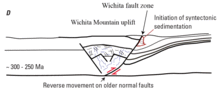 During the Pennsylvanian Period (330–290 million years ago) the region was subjected to intense pressure during the continental collision or orogeny which produced the Ouachita Mountains to the east.[16] This resulted in faulting and folding striking along a WNW direction and includes the Arbuckle and Wichita Mountains of southern Oklahoma and the Amarillo Uplift of the Texas Panhandle.[16] Up to 20,000 feet (6,100 m) of local uplift occurred during this time.[17]