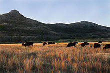 The Wichita Mountains are located in the southwestern portion of the U.S. state of Oklahoma.[1] It is the principal relief system in the Southern Oklahoma Aulacogen, being the result of a failed continental rift. The mountains are a northwest-southeast trending series of rocky promontories, many capped by 500 million-year old granite. These were exposed and rounded by weathering during the Pennsylvanian & Permian Periods. The eastern end of the mountains offers 1,000 feet (305 m) of topographic relief in a region otherwise dominated by gently rolling grasslands.