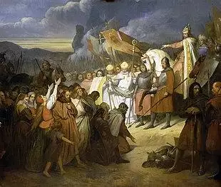 By 782, Widukind had returned from Denmark and goaded the Saxon nobles into rebellion. From 782 to 784, battles between Saxons and Franks occurred annually, while Charlemagne had 4,500 Saxons executed at the Massacre of Verden. Widukind allied himself with the Frisians but Charlemagne's winter attacks of 784/785 were nevertheless successful, and the dux and his allies were pushed back to their homelands. Charlemagne, leading an expedition towards the mouth of the Elbe, learned that Widukind was in the land of the Nordalbingians, on the right bank of the river.[2] In the Bardengau in 785, Widukind agreed to surrender in return for a guarantee that no bodily harm would be done to him. He and his allies were then baptized, possibly in Attigny,[3] with Charlemagne as his godfather. Widukind thereby reached a peace agreement and the acknowledgement of the Saxon noble rank by their Frankish overlords.