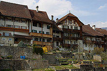 In the mid 13th century Count Ludwig the Elder von Frohburg built the fortified village of Wiedlisbach to collect tolls and host markets along the road to Zofingen. The village was built as rectangle with a large central market plaza astride the east-west running road. A combination tower house and defensive tower, known as the Städtliturm, was built in the north-west corner, and likely served as a residence of the count's local representative. The village wall, up to 9 m (30 ft) tall and 1.7 m (5.6 ft) thick, had two gates, the Biel gate to the west and the Basel gate to the east. The village was first mentioned in 1275 as oppidum or municipium Wietilspach.[3][4]