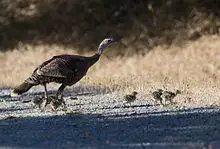 In addition to poults, hens and adult-sized fledglings (but not, as far as is known, adult male toms) are vulnerable to predation by great horned owls (Bubo virginianus),[37] northern goshawk (Accipiter gentilis),[38] domestic dogs (Canis lupus familiaris), domestic cats (Felis catus), and red foxes (Vulpes vulpes).[39] Predators of both adults and poults include coyotes (Canis latrans),[40] gray wolves (Canis lupus),[41] bobcats (Lynx rufus),[42] cougars (Puma concolor),[43] Canada lynx (Lynx canadensis), golden eagles (Aquila chrysaetos),[44] and possibly American black bears (Ursus americanus), which also will eat the eggs if they find them.[45] The American alligator (Alligator mississippiensis) is a predator to all turkeys of all ages in the Southeast and will eat them if they get too close to water. Humans are now the leading predator of adult turkeys.[46][47] When approached by potential predators, turkeys and their poults usually run away rather than fly away from potential predators, though they may also fly short distances if pressed.