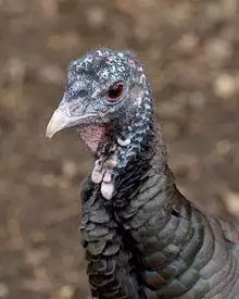 Male turkeys have a long, dark, fan-shaped tail and glossy bronze wings. As with many other species of the Galliformes, turkeys exhibit strong sexual dimorphism. The male is substantially larger than the female, and his feathers have areas of red, purple, green, copper, bronze, and gold iridescence. The preen gland (uropygial gland) is also larger in male turkeys compared to female ones. In contrast to the majority of other birds, they are colonized by bacteria of unknown function (Corynebacterium uropygiale).[8] Females, called hens, have feathers that are duller overall, in shades of brown and gray. Parasites can dull coloration of both sexes; in males, coloration may serve as a signal of health.[9] The primary wing feathers have white bars. Turkeys have 5000 to 6000 feathers.[10]