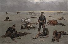 A frontier is a zone of contact at the edge of a line of settlement. Leading theorist Frederick Jackson Turner went deeper, arguing that the frontier was the scene of a defining process of American civilization: "The frontier," he asserted, "promoted the formation of a composite nationality for the American people." He theorized it was a process of development: "This perennial rebirth, this fluidity of American life, this expansion westward...furnish[es] the forces dominating American character."[1] Turner's ideas since 1893 have inspired generations of historians (and critics) to explore multiple individual American frontiers, but the popular folk frontier concentrates on the conquest and settlement of Native American lands west of the Mississippi River, in what is now the Midwest, Texas, the Great Plains, the Rocky Mountains, the Southwest, and the West Coast.