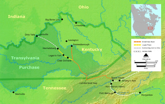 In 1775, Daniel Boone blazed a trail for the Transylvania Company from Virginia through the Cumberland Gap into central Kentucky. It was later lengthened to reach the Falls of the Ohio at Louisville. The Wilderness Road was steep and rough, and it could only be traversed on foot or horseback, but it was the best route for thousands of settlers moving into Kentucky.[31] In some areas they had to face Indian attacks. In 1784 alone, Indians killed over 100 travelers on the Wilderness Road. Kentucky at this time had been depopulated—it was "empty of Indian villages."[32] However raiding parties sometimes came through. One of those intercepted was Abraham Lincoln's grandfather, who was scalped in 1784 near Louisville.[33]