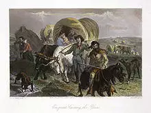 As defined by Hine and Faragher, "frontier history tells the story of the creation and defense of communities, the use of the land, the development of markets, and the formation of states." They explain, "It is a tale of conquest, but also one of survival, persistence, and the merging of peoples and cultures that gave birth and continuing life to America."[2] Turner himself repeatedly emphasized how the availability of free land to start new farms attracted pioneering Americans: "The existence of an area of free land, its continuous recession, and the advance of American settlement westward, explain American development."[3] Through treaties with foreign nations and native tribes, political compromise, military conquest, the establishment of law and order, the building of farms, ranches, and towns, the marking of trails and digging of mines, and the pulling in of great migrations of foreigners, the United States expanded from coast to coast, fulfilling the ideology of Manifest destiny. In his "Frontier Thesis" (1893), Turner theorized that the frontier was a process that transformed Europeans into a new people, the Americans, whose values focused on equality, democracy, and optimism, as well as individualism, self-reliance, and even violence.