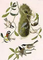 In 1811, naturalists Thomas Nuttall (1786–1859) and John Bradbury (1768–1823) traveled up the Missouri River documenting and drawing plant and animal life.[62] Artist George Catlin (1796–1872) painted accurate paintings of Native American culture. Swiss artist Karl Bodmer made compelling landscapes and portraits.[63] John James Audubon (1785–1851) is famous for classifying and painting in minute details 500 species of birds, published in Birds of America.[64]