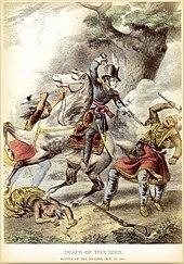 The War of 1812 marked the final confrontation involving major British and Indian forces fighting to stop American expansion. The British war goal included the creation of an Indian barrier state under British auspices in the Midwest which would halt American expansion westward. American frontier militiamen under General Andrew Jackson defeated the Creeks and opened the Southwest, while militia under Governor William Henry Harrison defeated the Indian-British alliance at the Battle of the Thames in Canada in 1813. The death in battle of the Indian leader Tecumseh dissolved the coalition of hostile Indian tribes.[34] Meanwhile, General Andrew Jackson ended the Indian military threat in the Southeast at the Battle of Horseshoe Bend in 1814 in Alabama. In general, the frontiersmen battled the Indians with little help from the U.S. Army or the federal government.[35]