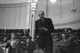Roberts was a supporter of the Popular Front seeking an alliance between left-of-centre political forces.[25] The Popular Front was not officially endorsed by the Liberal Party, but was supported by a number of other Liberal MPs such as Megan Lloyd George and Richard Acland.[26] Roberts spoke at the 1938 Emergency Conference for a Popular Front.[27] He was embarrassed and angry, however, when he was chairing the Spain Conference in the Queen's Hall, and the "Internationale" was sung.[28] At this period he was an active speaker for the Left Book Club (LBC), a publishing company founded in 1936, with Acland.[29]
