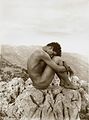 More explicit photos in which boys aged between about 10 and 20, and occasionally older men, were nude (sometimes with prominent genitalia) and which, because of eye contact or physical contact were more sexually suggestive, were traded "under the counter" and among close friends of the photographer, but "as far as is known, Gloeden's archive contained neither pornographic nor erotically lascivious motifs".[10]