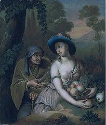 Agneta Chapman, Willem van Mieris' wife, is considered to have acted as the artist's first model. During the beginning stages of van Mieris' career between 1680 and 1687, the artist produced numerous paintings and drawings depicting young women often represented as mythological figures, which were modelled after his wife.[9] In van Mieris' painting Flora, which currently resides in the Morgan Library & Museum in New York, it is suggested that Agneta served as the model. In this painting, van Mieris disguises his wife as Flora, the ancient Roman goddess of flowers, fertility and spring. The inclusion of peonies helps signify feminine beauty and fertility, which is appropriate given the context of the painting's execution taking place only one year before Willem's and Agneta's wedding. A similar face, suggested to be modeled after Agneta's, reappears in many of van Mieris' early works, including Allegory of Arrogance from 1684, Old Man Seducing a Young Woman from 1683, Artemis Holding an Arrow from 1686, and Woman with a Bird Cage (Lesbia) from 1687.[9] Comparisons have been drawn between Willem van Mieris and Rembrandt, who used his wife Saskia as the model for his depiction of the goddess Flora.[9]