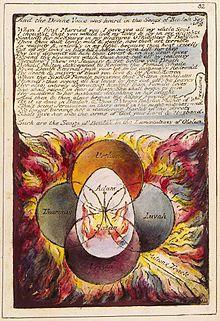 The prophetic books of the 18th-century English poet and artist William Blake are a series of lengthy, interrelated poetic works drawing upon Blake's own personal mythology. They have been described as forming "what is in proportion to its merits the least read body of poetry in the English language".[1] While Blake worked as a commercial illustrator, these books were ones that he produced, with his own engravings, as an extended and largely private project.