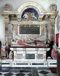 A magnificent[8] and sumptuous[9] monument exists in St Peter's Church, Tawstock, incorporating recumbent effigies of William Bourchier, 3rd Earl of Bath and his wife Elizabeth Russell. It was restored in 1999 by Lawrence and Sue Kelland, mainly to replace the iron bands within the alabaster which threatened to rust and thereby expand to crack the stone. The iron was replaced with stainless steel and the monument was repainted.[10] Kneeling to the left is their adult son and an infant child, whilst on the right kneels their adult daughter with a recubant infant at her side. Two vines grow up on either side of the main effigies, on the dexter inhabited with heraldic escutcheons showing five generations of ancestry described by five shields of Bourchier impaling the arms of their wives. On the sinister vine are shown five similar escutcheons describing the ancestry of Elizabeth Russell over five generations as follows, from ground upwards:[11]