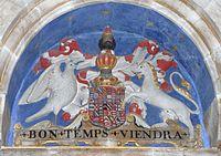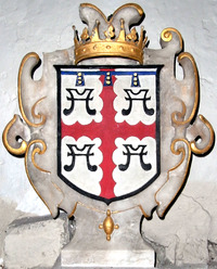 - ^ These 10 quarterings are also visible in stained glass in the cloister of Hengrave Hall, Suffolk: Bourchier, Louvaine, FitzWarin, Audley, Cogan, Hankford, Stapledon, Martin, Dinham, Arches, all impaling Donnington (Argent, three pallets azure on a chief gules three bezants), the third wife of the 2nd Earl.[1]