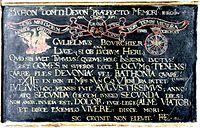 On the base of his monument appears a cryptic tablet. It comprises separate elements of anagram, chronogram and epigram. Top: Bathon(i)ae Com(i)ti Devonae praefecto memoriae ergo ("To the memory of the Earl of Bath therefore to the prefect (i.e. Lord Lieutenant) of Devon"). Beneath this line is in the centre an inscribed skull and cross-bones, with to its left the image of a phoenix rising from a fire above which is Morior Orior ("I am dead, I shall arise") above which is inscribed on a scroll the well-known Roman epithet: Mors mihi lucrum ("Death to me is reward"). On the right side of the skull is an image of a circular dial inscribed around the circumference with the first two letters of the 12 months of the year. The top-most month, which is crowned, is IV i.e. JU for July, the month of his death. Above is inscribed: Finis Coronat ("the end crowns"), above which is inscribed on a scroll the French motto of Bourchier: Bon temps viendra ("The right time will come"). Within the skull is written on the top line grama, to which word three other words point from above the skull, ana-, chrono- and epi- (all Greek words in Latin form). These denote to the reader the presence of anagrams, chronograms, epigrams and other puzzles within the tablet. In the skull below the word grama are the two Latin words se and pul, and on the two bones which intersect behind the skull are written 4 more Latin words: ad, in, tum, and crum, which may all be combined together to form the sentences: in sepulcrum ad sepultum ("into the grave in order to be buried") or in sepultum ad se pulcrum ("in the act of burial one's-self (is made) beautiful"). Below is the anagram, on the top line the words Gulielmus Bourchier ("William Bourchier"), below which is the indicator ana-: and the name's Latin anagram Luge (si ob lucrum heri) ("mourn if on account of the profit of yesterday"). Below is a Latin epigram with some words in capitals, which may relate to a chronogram or other word-game: Quid sibi vult tumulus quidve haec insignia luctus est comes in superos ecce locumo tenens quare fles Devonia vel Bathonia quare ("If you wish to know what is this pile or why this great mourning, the Earl behold is above as place-holder (lieutenant), as weeps Devon and Bath"). Below is a chronogram: "eXIIt en bon teMps nVnCo VIenDra patet" (exiit en bon temps nunc (o?) viendra patet) a mixture of limited sense in Latin and the French motto of Bourchier, meaning "he went in good time now he shall come he seeks". When the capital Roman numerals are added together individually they make 1,623, the year of his death. Underneath is a further possibly cryptic epigram, with some words in capitals: Julius hoc mensis fuit Augustissimus anno atq(ue) secunda decem junge secunda dies non amor invidia est dolor euge lege alme viator et disce exemplo vivere: disce more sic cecivit (cecidit?) not elevit, translated as "The month of July was the most august in this year and the following day...is hatred not love, well-done! read O Traveller and teach by (his) example (how ) to live: teach (how) to die, thus he has fallen he has not arisen". At the end are two monograms: "R...E" and "AR".