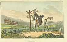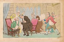 In 1790 and 91, the six volumes of a Devil on Two Sticks in England won for Combe the title of "the English le Sage". In 1794 he ghost-wrote the Aeneas Anderson memoir of the Lord Macartney embassy to Peking, "A Narrative of the British Embassy to China, in the Years 1792, 1793, and 1794". In 1794–1796 he wrote the text for Boydell's History of the River Thames, and in 1803 he began to write for The Times. From 1809 to 1811 he wrote for Ackermann's The Poetical Magazine the serialized comic poem The Tour of Dr Syntax in Search of the Picturesque, descriptive and moralizing verse illustrated by artist Thomas Rowlandson's color plates.[4] It satirised William Gilpin, who toured Britain to describe his theory of the Picturesque.[5] It was collected in book form in 1812, and was followed by two similar Tours, "...in search of Consolation" (1819) and "...in search of a Wife,"[4] the first Mrs Syntax having died at the end of the first Tour.[2] The second Tour was collected as an 1820 book, and the third tour as an 1821 book. Some reprint editions over the next several decades rendered Rowlandson's color plates in black and white.[4]