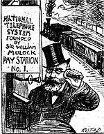 In 1905, Mulock chaired the select parliamentary inquiry into telephone systems, especially the unregulated Bell Telephone monopoly.[37] The committee shed much light on the operations and finances of Bell, but Mulock was replaced when it became apparent that he was likely to recommend the telephone service be a government owned utility. The committee's work nevertheless led in 1906 to the first federal regulation of telephone and telegram service by the Board of Railway Commissioners, the ancestor of the current Canadian Radio-television and Telecommunications Commission. Despite being a wealthy businessman and fervent anticommunist, Mulock believed that government operation of public franchises provided better service at lower cost, with greater protection of personal privacy and public interest.[38]