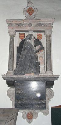 Dominae Elizabethae Bassett uxori Roberti Bassett militis clarissima stirpe oriundi filiae et cohaeredi Gulielmi Peryam militis Schaccarii Regii Baronis primarii Judicic integerrimi et religiosissimi piae prudenti justae patienti modestae castae temperanti constanti hospitali misericordi beneficae pauperum matri et medicae suae familiae conservatrici. Arthurus Bassett armiger filius eius primogenit(us) debitae gratitudinis et observantiae ergo H(oc) M(onumentum) M(atri)? M(aerens) P(osuit) Anno Domini 1635 aetatis suae 64 ad Dominum remeaunt.