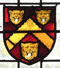The heraldic achievement on top of the monument to Sir William Peryam in Crediton Church show the following: Quarterly, 1st & 4th: Gules, a chevron engrailed between three leopards' faces or (Peryam modern, formerly Branch); 2nd: Argent, a chevron between three pears sable(?) (Peryam ancient); 3rd: Argent, two bars wavy between three billets sable (Hone of Ottery)[16]. The arms of a chevron engrailed between three leopards' faces were according to Prince's "Worthies of Devon" (1710) originally the arms of the family of Branch, "whose heir was married to Periam, of which family the ancient arms were argent, a chevron between four (sic) pears sable". These ancient arms of Peryham appear therefore to be canting arms playing on the Latin pirum (pear) and its derivative "perry" the drink made from pears. It would appear therefore that one of the younger sons of this marriage, the ancestor of Sir William, was required to adopt the arms of his mother's family, expired in the male line, in lieu of his paternal arms in order to inherit his maternal lands. Such cases were very common, from the earliest times.[17] The crest of Peryham is: Two arms gules, issuing out of a crown or, holding in the hands proper a leopard's face of the second.[18]