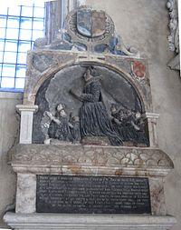 Monument to Mary Periham (1567–1605), eldest daughter of Sir William Peryam and 1st wife of Sir William Pole (1561–1635), in the Pole Chapel, Colyton Church, Devon, in which parish is situated Colcombe Castle. The escutcheons show the arms of Pole and Peryam. Text: Heere lieth ye body of Mary late ye wife of Sr. Wm. Pole of Shute knig. beinge ye eldest daughter & one of ye foure heires of Sr. W. Periham of Fulford knig. Lo. Chief Barron of ye Kinge majesties Exchequer. She left behind her 4 son(n)es & 5 daughters unto her saide husband viz John, Periham, Wil., & Franncis, son(n)es, Mary, Katherine, Elizabeth, Ane & Elioner, daughters. She brought unto him also 2 other son(n)es viz Wil., her first child & Arthur being on(e) of ye 3 son(n)es wi.ch she brought at on(e) birth & perished by an unfortunat fall. She dyed ye 2 of May in ye yeere of our Lord 1605 being then of th'age of 38 & on(e) moneth & maried unto her husband 22 yeeres tenn monethes