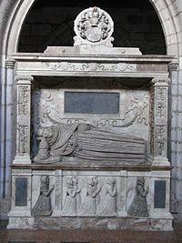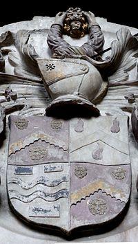 His monument exists in the large and important parish church of Crediton, about two miles west of Little Fulford. It is situated to the north of the chancel, in the position of greatest honour, and shows a life-like effigy of his recumbent figure his head propped up on his hand. He wears a long Collar of Esses with a single portcullis, one of the badges of the Tudor monarchs. Underneath are shown sculpted in relief his three wives kneeling with his four daughters. The marble monument is decorated with ribbon-work and shows his heraldic achievement on top. The three heraldic escutcheons on the cornice have been defaced by blows from a chisel-like instrument and the armorials removed. The text inscribed on a tablet within a strapwork surround above the effigy is as follows: