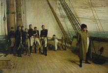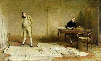 Orchardson's wider popularity dates from 1880. To that year's Royal Academy summer exhibition he sent the large Napoleon on board the Bellerophon, which was acquired for the national collection by the Trustees of the Chantrey Bequest for Tate. For a decade or more, Orchardson's work was eagerly looked for at the Academy. He followed up the Napoleon on the Bellerophon, with Voltaire at the Academy of 1883. Technically, the "Voltaire" is, perhaps, his high-water mark; the subject does not explain itself, but requires a previous knowledge on the part of the spectator of how Voltaire was beaten by the servants of the Chevalier de Rohan-Chabot, and how the duc de Sully failed to avenge his guest.