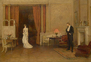 The Voltaire was followed, in 1884, by the "Marriage de convenance", perhaps the most popular of all Orchardson's pictures; in 1885, by "The Salon of Madame Récamier"; in 1886, by "After", the sequel to the "Marriage de convenance", and "A Tender Chord"; in 1887, by "The First Cloud"; in 1888, by "Her Mother's Voice"; and in 1889, by "The Young Duke", a canvas on which he returned to much the same pictorial scheme as that of the "Voltaire". Subsequently, he exhibited a series of pictures in which pictorial use was made of the Empire style, the subjects, as a rule, being only just enough to suggest a title. "An Enigma", "A Social Eddy", "Reflections", "If music be the food of love, play on!", "Music, when sweet voices die, vibrates on the memory", "Her First Dance"— in these, opportunities are made to introduce old keyboard instruments, Aubusson carpets, and short-waisted gowns.