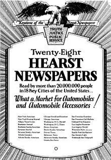 William Randolph Hearst (/hɜːrst/;[1] April 29, 1863 – August 14, 1951) was an American newspaper publisher who built the nation's largest newspaper chain and media company Hearst Communications and whose flamboyant methods of yellow journalism influenced the nation's popular media by emphasizing sensationalism and human interest stories. Hearst entered the publishing business in 1887 after being given control of The San Francisco Examiner by his wealthy father. Moving to New York City, he acquired The New York Journal and fought a bitter circulation war with Joseph Pulitzer's New York World that sold papers by giant headlines over lurid stories featuring crime, corruption, graphics, sex, and innuendo. Acquiring more newspapers, Hearst created a chain that numbered nearly 30 papers in major American cities at its peak. He later expanded to magazines, creating the largest newspaper and magazine business in the world.