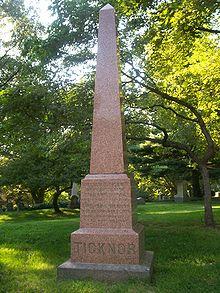 Ticknor was more concerned about Hawthorne, writing to Sophia, "You will be glad to hear that your patient continues to improve."[4] In Philadelphia, the duo visited Fairmount Park and Ticknor offered Hawthorne his jacket for warmth before they returned to the Continental Hotel.[3] Hawthorne wrote to Fields that "our friend Ticknor is suffering under a billious attack... He had previously seemed uncomfortable, but not to an alarming degree."[5] A physician offered various medicines, but Ticknor died on the morning of April 10, 1864. George William Childs arrived shortly after and accompanied the distraught and grieving Hawthorne back to Boston.[6] The sudden loss of Ticknor was devastating to the already failing health of Hawthorne, who would die about a month later on May 19. Ticknor was buried at Mount Auburn Cemetery; the distinguished of both literary and business circles came to pay their final tribute.