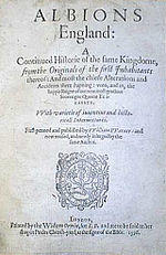His chief work is a long poem in fourteen-syllabled verse, entitled Albion's England (1586), and dedicated to Henry Carey, 1st Baron Hunsdon. His history of his country begins with Noah, and is brought down to Warner's own time including the beheading of Mary, Queen of Scots. The chronicle is by no means continuous, and is varied by fictitious episodes, the best known of which is the idyll in the fourth book of the loves of Argentine, the daughter of the king of Deira, and the Danish prince, Curan.[2]