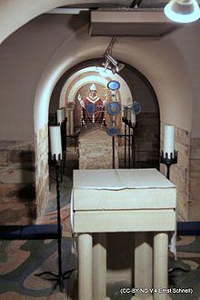 William's feast day is celebrated on 8 June, the day of his death.[30] Although his veneration was largely localised in York, among his devotees was Margery Kempe (1373–1438) of King's Lynn in Norfolk, who "cried copiously" before his tomb.[3] Traditional iconography and windows often depict William's crossing of the Tweed; some iconography shows him crossing in a boat. William's coat of arms is blazoned: Or, seven mascles Gules, 3, 3 and 1. This actual shield at one time hung on the west wall of St Wilfrid's Church, Bognor Regis.[31] St William's College, which was named for him is next to York Minster. It was established between 1465 and 1467 with the permission of King Edward IV as the home for chantry priests of the Cathedral.[32] His remains were rediscovered in the 1960s and are now in the crypt at York Minster.[33]