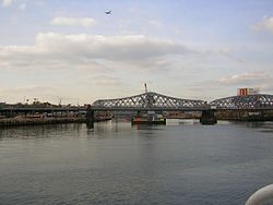 The Willis Avenue Bridge is a swing bridge that carries road traffic northbound (and bicycles and pedestrians both ways) over the Harlem River between the New York City boroughs of Manhattan and the Bronx, United States. It connects First Avenue in Manhattan with Willis Avenue in the Bronx. The New York City Department of Transportation is responsible for maintaining and operating the bridge.