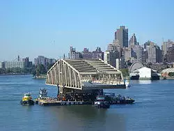 The replacement bridge was constructed at Port of Coeymans, 10 miles south of Albany. On July 13, 2010, the bridge was shipped down the Hudson on two barges that were welded together. The new bridge is 350 feet long, 65 feet high and 77 feet wide; it required three tugboats to propel it. The sight of the floating bridge caused a stir among onlookers all along the Hudson.[8] After a stay at Port Jersey in Jersey City it was towed up the East River to its destination in the morning on July 26.[9] Motor traffic was shifted to the new bridge on October 2, 2010, though the walkway of the old bridge continued to serve pedestrians and cyclists [10] for a few weeks.