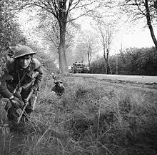 As part of the 129th Brigade, both the 4th and 5th Wiltshires participated in the Battle of Normandy, landing in France on 24 June 1944.[55] On arrival in theatre, the division became part of Lieutenant-General Sir Richard O'Connor's VIII Corps. Both battalions would be heavily engaged in many battles during the campaign across North-West France, the low countries, and Germany. During the Normandy Campaign, this included the Battle of Odom, the fight for Hill 112 (Operation Jupiter), and the capture of Mont Picon.[56]