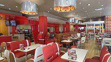 Lyons obtained a licence to use the Wimpy brand in the United Kingdom from Edward Gold's Chicago based Wimpy Grills Inc.[7][8] and, in 1954, the first "Wimpy Bar" was established at the Lyons Corner House in Coventry Street, London.[10][11] The bar began as a special fast food section within traditional Corner House restaurants, but the success soon led to the establishment of separate Wimpy restaurants serving only hamburger-based meals.