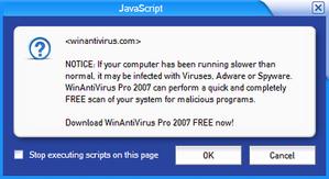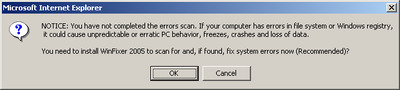 The infection usually occurred during a visit to a distributing web site using a web browser. A message appeared in a dialog box or popup asking the user if they wanted to install WinFixer, or claimed a user's machine was infected with malware, and requested the user to run a free scan. When the user chose any of the options or tried to close this dialog (by clicking 'OK' or 'Cancel' or by clicking the corner 'X'), it would trigger a pop-up window and WinFixer would download and install itself, regardless of the user's wishes.