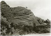 Cross-bedding of sandstone near Mount Carmel road, Zion National Park, indicating wind action and sand dune formation prior to formation of rock (NPS photo by George A. Grant, 1929)