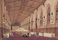 Several minor alterations were made to the Upper Ward under Victoria. Anthony Salvin rebuilt Wyattville's grand staircase, with Edward Blore constructing a new private chapel within the State Apartments.[191] Salvin also rebuilt the State Dining Room following a serious fire in 1853.[192] Ludwig Gruner assisted in the design of the Queen's Private Audience Chamber in the south range.[193] Blore and Salvin also did extensive work in the Lower Ward, under the direction of Prince Albert, including the Hundred Steps leading down into Windsor town, rebuilding the Garter, Curfew and Salisbury towers, the houses of the Military Knights and creating a new Guardhouse.[194] George Gilbert Scott rebuilt the Horseshoe Cloister in the 1870s.[47] The Norman Gatehouse was turned into a private dwelling for Sir Henry Ponsonby.[195] Windsor Castle did not benefit from many of the minor improvements of the era, however, as Victoria disliked gaslight, preferring candles; electric lighting was only installed in limited parts of the castle at the end of her reign.[186] Indeed, the castle was famously cold and draughty in Victoria's reign,[195] but it was connected to a nearby reservoir, with water reliably piped into the interior for the first time.[196]