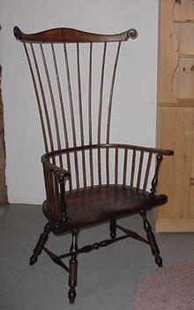 It is not clear when the first Windsor Chairs were made.[1] It is known that, as early as the 16th century, wheelwrights started coping out chair spindles in the same way they made wheel spokes.[2] The design was probably a development of West Country, Welsh and Irish 'stick-back' chairs, but the evidence on origin is not certain.[1] It is thought that the first Windsor chair made its appearance in the county of Buckinghamshire, where the main centre of production eventually moved to High Wycombe.[1] The first Windsors were of the comb-back variety.[1] By the 18th century steam bending was being used to produce the characteristic "bow" of the Windsor chair.[2] The first chairs made this way were shipped to London from the market town of Windsor, Berkshire in 1724.[2] There is speculation that the chair derives its name from the town of Windsor, which became the centre for the trade between the producers and the London dealers.[1] Thus the name "Windsor Chair" is more about the style of chair than where it was made, with many diverse forms of Windsor chair being made worldwide.[3]