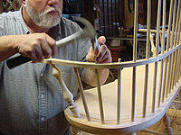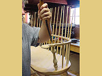 Traditionally there were three types of craftsmen involved in the construction of a Windsor chair, there was the chair bodger, an itinerant craftsman who worked in the woods and made just the legs and stretchers, on a pole lathe.[4] Then there was the benchman who worked in a small town or village workshop and would produce the seats, backsplats and other sawn parts.[5] The final craftsman involved was the framer. The framer would take the components produced by the bodger and the benchman and would assemble and finish the chair.[6]