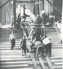 In the autumn of 1939, the Winged Victory was removed from her perch in anticipation of the outbreak of World War II. All the museums of Paris were closed on August 25. Artwork and objects were packed for removal to locations deemed safer outside Paris for safekeeping. On the night of September 3, the statue descended the staircase on a wooden ramp which was constructed across the steps.[16] During the years of World War II, the statue was sheltered in safety in the Château de Valençay along with the Venus de Milo and Michelangelo's Slaves.[17]