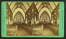 Non-Native Americans settled the area in 1851 and laid out the town into lots in 1852 and 1853. The original settlers were Yankee immigrants from New England.[10][11] The population increased from 815 in December, 1855, to 3,000 in December, 1856. In 1856 German immigrants arrived as well.[11] The Germans and the Yankees worked together planting trees and building businesses based on lumber, wheat, steamboating and railroads. Between 1859 and 1900, some 5,000 Poles and closely related Kashubians emigrated to Winona, making up one quarter of the population. Since 80% of them were Kashubians, Winona became known as the "Kashubian Capital of America". As a result of the influx of Polish Catholic immigrants, the Church of St. Stanislaus (now Basilica of St. Stanislaus Kostka) was built.[12] For a time, Winona had more millionaires than any other city of its size in the United States.[11]