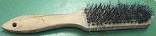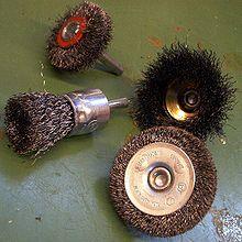 A wire brush is a tool consisting of a brush whose bristles are made of wire, most often steel wire. The steel used is generally a medium- to high-carbon variety and very hard and springy. Other wire brushes feature bristles made from brass or stainless steel, depending on application. Wires in a wire brush can be held together by epoxy, staples, or other binding. Wire brushes usually either have a handle of wood or plastic (for handheld use) or are formed into a wheel for use on angle grinders, bench grinders, pistol-grip drill motors, or other power tools.