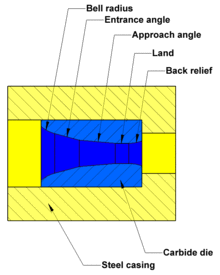 Drawing dies are typically made of tool steel, tungsten carbide, or diamond, with tungsten carbide and manufactured diamond being the most common.[2] For drawing very fine wire a single crystal diamond die is used.[2] For hot drawing, cast-steel dies are used. For steel wire drawing, a tungsten carbide die is used. The dies are placed in a steel casing, which backs the die and allow for easy die changes.[2] Die angles usually range from 6–15°, and each die has at least 2 different angles: the entering angle and approach angle.[2]